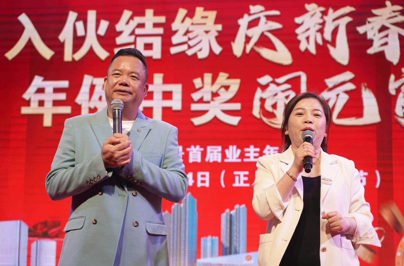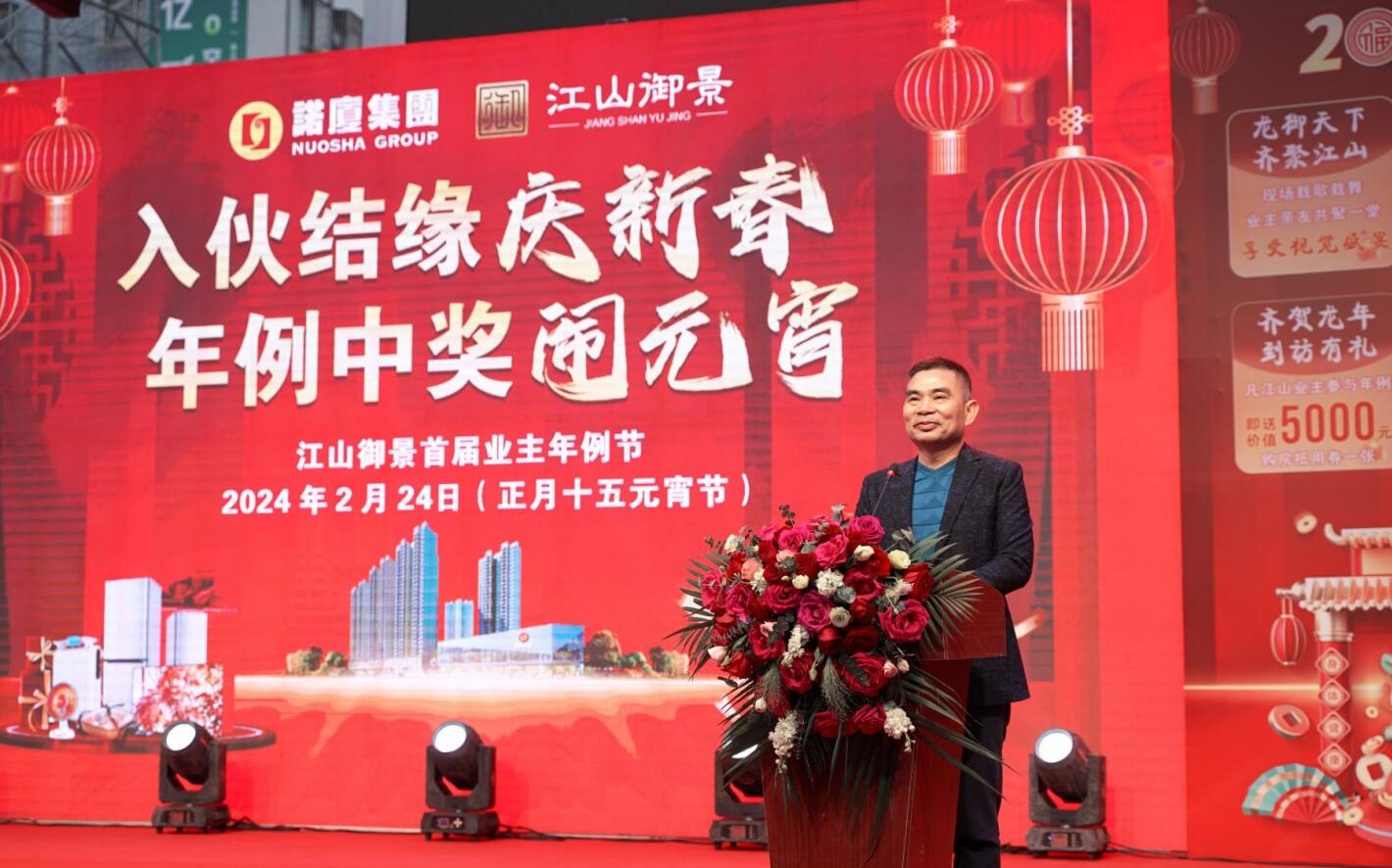 下午18時,隨著一場震撼的音樂節(jié)目拉開了活動的序幕,伴著鏗鏘有力的鑼鼓節(jié)奏,現(xiàn)場氣氛逐漸走向高潮,活動正式開始。首先,由廣東諾廈建設(shè)集團有限公司董事長陳觀來先生,他代表公司向全體業(yè)主及在場的嘉賓送上誠摯的新春祝福,他表示江山御景首屆年例節(jié)的成功舉行,正式宣布江山御景項目全面建設(shè)完善,并拉開現(xiàn)樓發(fā)售序幕。機場大道的開通,貫通了南北交通要道,梅石中路的升級改造使東西要道更加方便,江山御景將迎來直達廣州深圳全程8車道時代。集團公司還將捐資完善靈村小學,讓江山御景孩子們實現(xiàn)教育無憂。項目商業(yè)體也隨之開啟,集團公司將攜同各位業(yè)主共同將江山御景建設(shè)成一個有溫度、有力量、有未來的美好家園!隨后業(yè)主代表上臺致辭,給在場嘉賓送上誠摯的新春祝福。